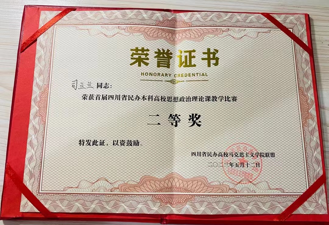司兰兰2023年5月12日荣获首届四川省民办本科高校思想政治理论课教学比赛二等奖。