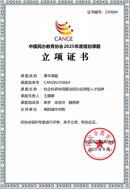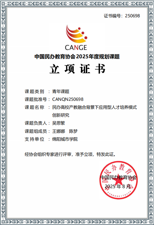 根据《中国民办教育协会课题管理办法(2025年修订)》和《关于申报中国民办教育协会2025年度规划课题的通知》规定,经中国民办教育协会组织专家评审,确定2025年度规划课题(青年课题)立项名单。吴思繁老师课题《民办高校产教融合背景下应用型人才培养模式创新研究》(课题编号:CANQN250698)和王娜娜老师课题《校企科研协同驱动民办应用型人才培养》(课题编号:CANQN250684)荣获立项。
